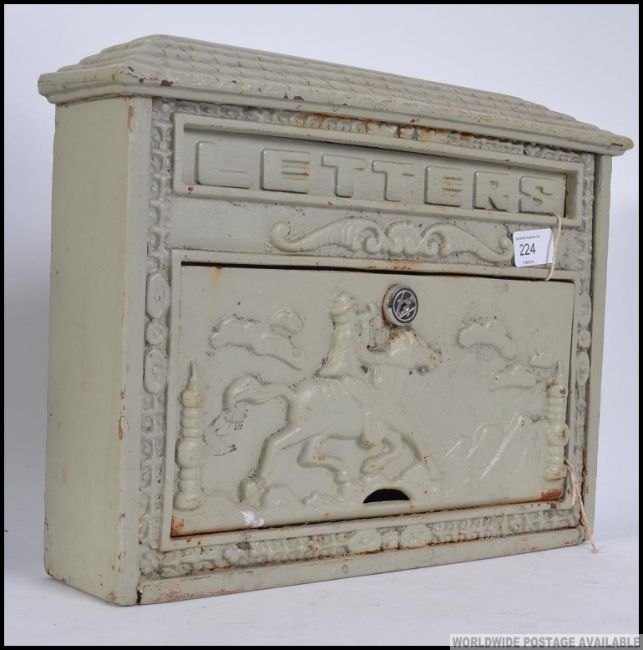A 20th century metal letter box with decorative hunting scenes facia ( see illustration )