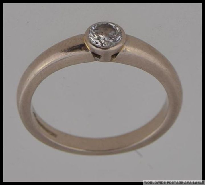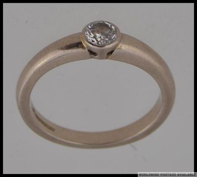 An 18ct / 750 white gold and diamond single stone buckle setting ring. The diamond approx 25pnts. Weight 3.8g / Size