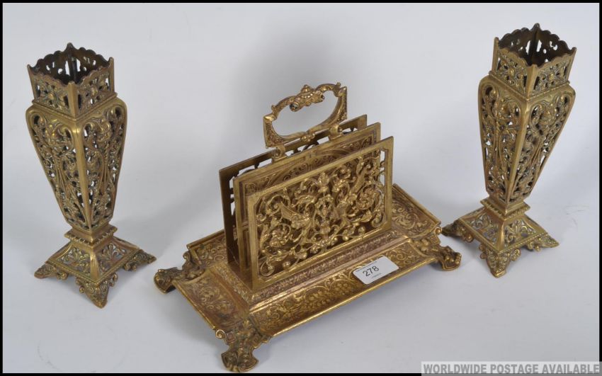A three piece 19th century brass Victorian desk tidy set, consisting of a fret pierced tidy with a pair of matching . Measures: 28cm H.