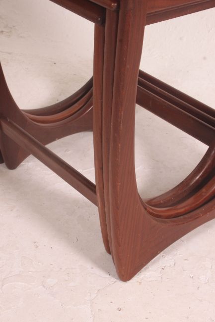 A 1970's G-Plan Kelso teak and tile top nest of tables. The tables of graduating form with tiled large table, plain smaller tables. Measure: 50cm x 50cm x 50cm.