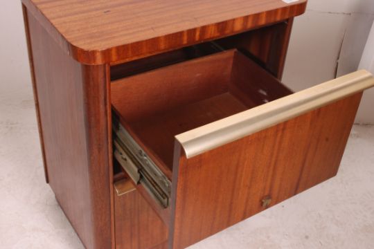 A retro mid century teak wood effect two drawer office filing cabinet by Abess, raised on castors with chrome pull handles. Measures: 75cm x 58cm x 46cm.