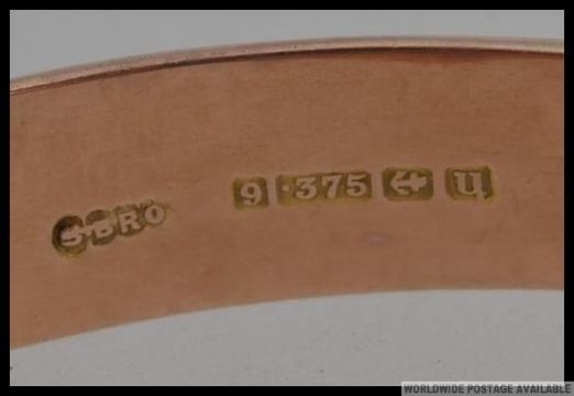 A hallmarked 9ct gold bangle bracelet with foliate scroll decoration with clip and safety clasp. Hallmarked for Birmingham 1919. Makers mark possibly Sydney Brothers. Weight 10.5g. Internal Diameter approx 6cms.