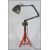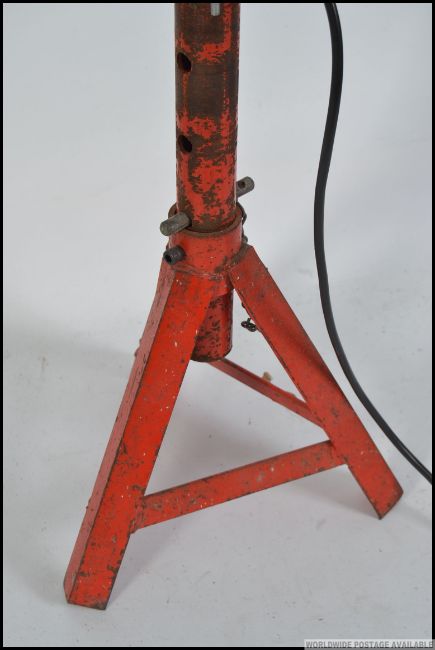 An industrial MEMLITE work lamp top converted into a table lamp by means of having a car jack base attached , fully adjustable including height . Grey enamel shade . Measures:76cm H in photo