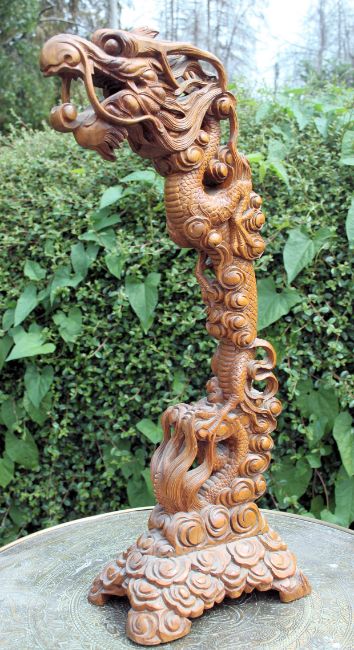 A 20th century Anglo - Indian oak brass topped occasional table along with a fantastic carved Chinese dragon. Measures: 63cm x 50cm diameter.