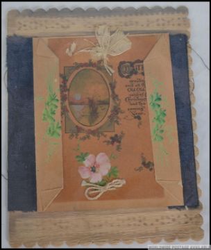 A Victorian Christmas card having upholstered card back with lace. Decorative centre with notation for ' With Greetings and all the old old wished Christmas and the coming year ' Further notation within. Measures: 19cm H