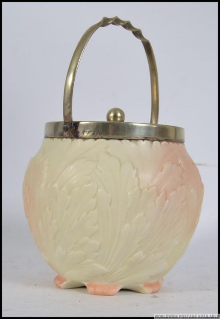 A Locke & Co Worcester porcelain biscuit barrel having ivory blush ground moulded with acanthus leaves having a silver plate collar and lid complete with the original handle. Black printed mark to base. Condition very good. Measures: 24cm H.