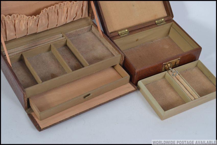 A near pair of vintage 20th century crocodile skin / leather jewellery boxes, each having brass locks ( one with key ) and fitted lined interiors