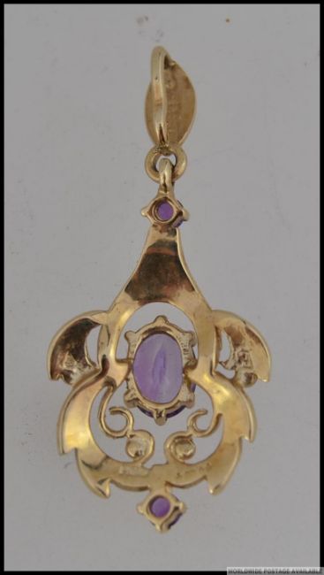 A hallmarked 9ct gold Art Nouveau pearl and amethyst drop necklace pendant . Hallmarked rubbed, tests 9ct. Measures 4.5cms. Weight 4.1g