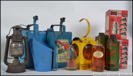 A good collection of vintage Automobilia to include Castrol oil bottles two Valor paraffin / oil cans, a retro shell jug , Castrol tins, boxed Savu heater and a Fuerhand baby 275 oil lamp. Measures: 26cm H.
