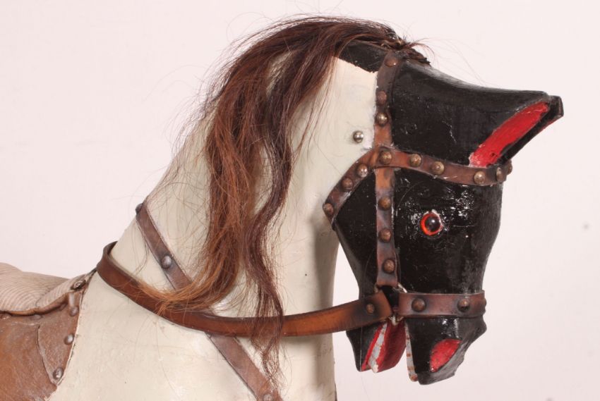 An early 20th century large wooden rocking horse raised on glider in the manner of Lines. The painted white horse with detailed face and mane. Measures: 114cm x 130cm.