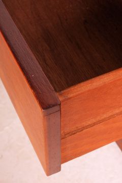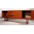 Retro / vintage Danish style teak sideboard circa 1960's, having a run of three drawers flanked by a pair of inset sliding doors opening to reveal shelved interior and another fall front door, raised on tapered legs united by central stretcher. Measures: 74cm x 206cm x 45cm.