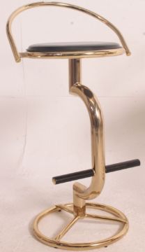A pair of retro style gilt bar stools, having black circular seat pads and raised foot rests. Measure: 92cm H.