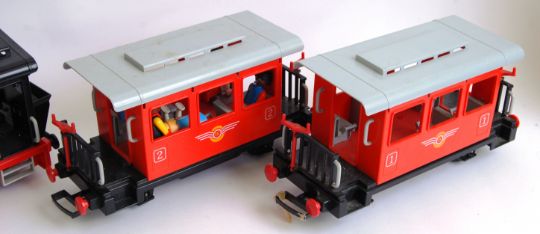 PLAYMOBIL G SCALE TRAIN: An original Playmobil G-Scale model train, electric. Unboxed, but does come with locomotive, two carriages, quantity of figures and track. Vendor assures us all is working and complete, however buyers are reminded to satisfy themselves as items are unchecked by us.