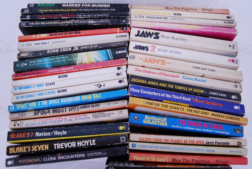 TV FILM FICTION: A large collection (3x boxes) of assorted vintage Fan Fiction / TV / Film related paperback novels and books etc. To include The Executioner by Dan Pendleton, Star Trek, Six Million Dollar Man, Space 1999, The Incredible Hulk, Blake's 7, Jaws etc.