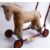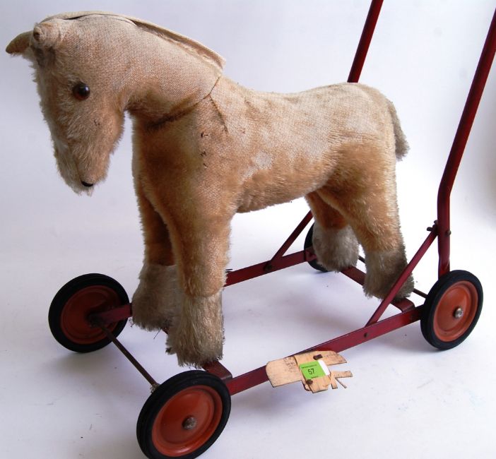 CHILTERN HORSE: A vintage Chiltern made push along ride on stuffed toy horse. Mounted on a metal frame in red, with rubber tyres. Footrests AF.