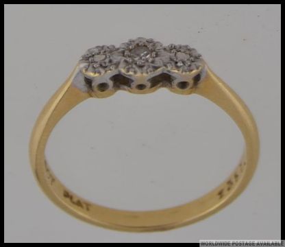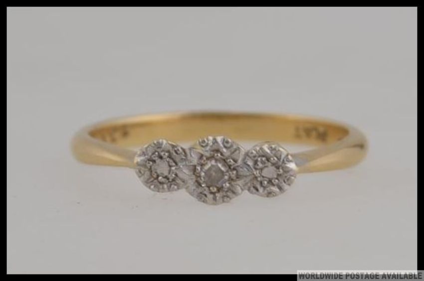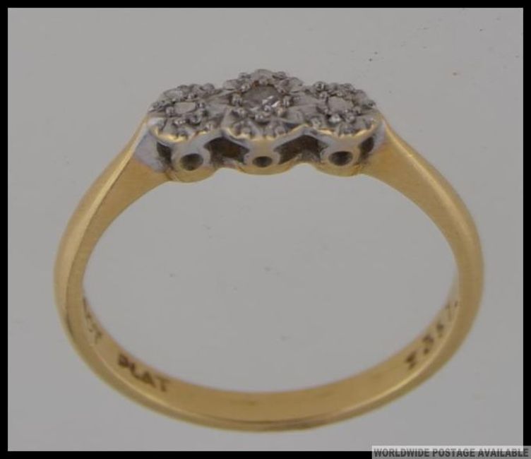 An 18ct gold and platinum diamond ring set with a central diamond with illusion platinum stones either side. Marked 18ct and Plat, tests 18ct and platinum. Weight 2g. Size J.5