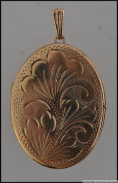 A large hallmarked 9ct gold locket pendant with scroll decoration to front and scalloped bale. Hallmarked for Birmingham 1978. Weight 10.7. Measures 5.5cms.