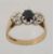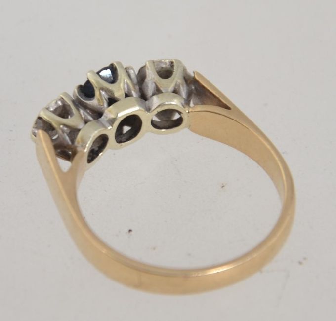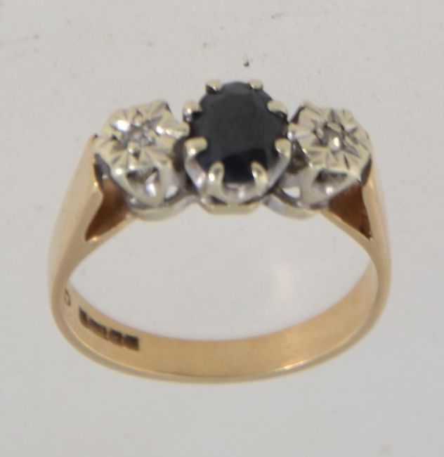 A hallmarked 9ct gold sapphire and diamond trilogy ring with a large prong set oval cut sapphire flanked by two star cut set diamonds. hallmarked for Birmingham. Weight 3.5g. Size N.
