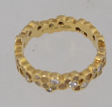 A hallmarked 18ct gold honeycomb diamond band ring set with approx 30pts of graduated diamonds in a honeycomb setting. Hallmarked for London Maker GEB. Size N.5 Weight. 4.9g.