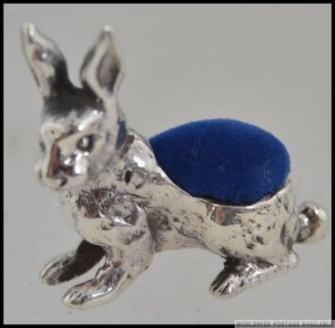 A silver ( stamped 925 ) pincushion in the form of a crouching alert rabbit / Hare, having a blue velvet cushion
