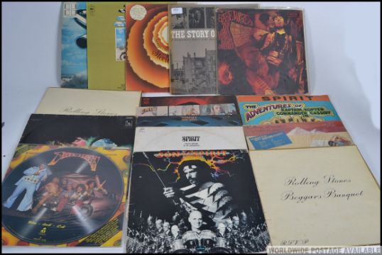 A collection of vinyl long play records to include Wizzard Brew, Eno - Here Come The Warm Jets, Tommy The Who, Sprit x 3 Twelve Dreams of Dr Sardonicus, The Adventures of Kaptain Kopter and Commander Cassidy in Potato Land and Sons of Spirit, The Rolling Stones Made In The Shade and Beggars Banquet x 2, Canned Heat Living The Blues, Dread Zepplin picture disc, John Mayalls Blues Breakers Bare Wires, Tubular Bells ( Quadrophonic ), The Byrds Ballad Of Easy Rider, Songs In The Key Of Life Stevie Wonder and The Story of the Blues compiled by Paul Oliver