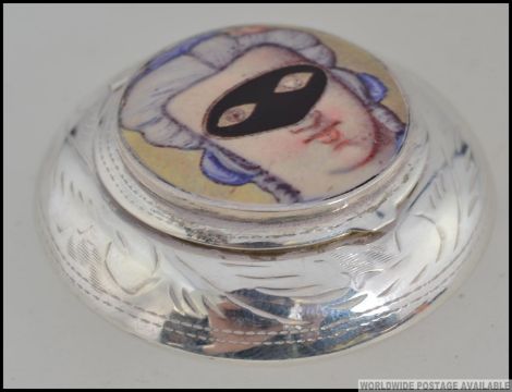 A silver embossed pill / snuff box with an applied pictorial enamel image of young maiden wearing a masquerade mask