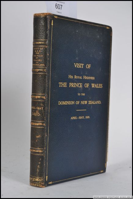 Visit of His Royal Highness The Prince of Wales to the Dominion of New Zealand. April-May, 1920. Scholefield, (Guy H.). W. A. G. Skinner, Wellington, 1926. Hardcover (Full Leather) bound in full navy blue crushed morocco leather with gilt titles on the back and on the upper board. Marbled endpapers. Rare.