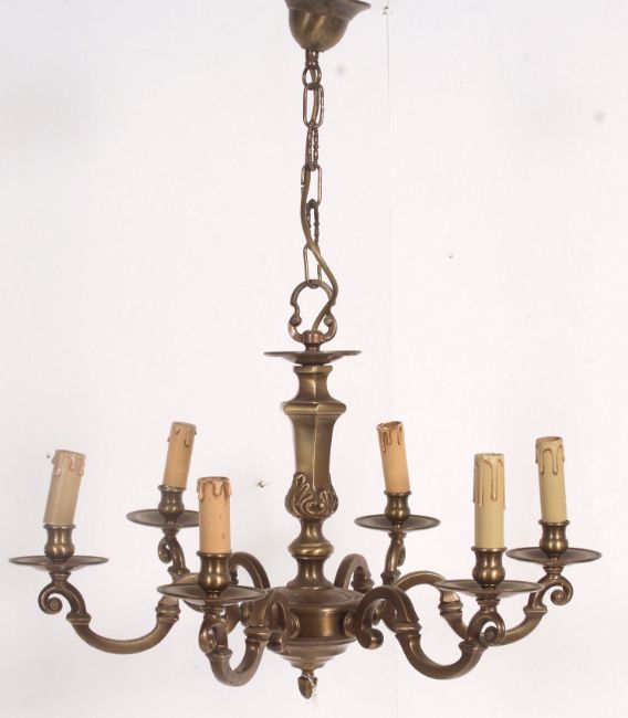 An 19th Century Style Brass Six Branch electric Chandelier. The scrolling candle-arms emanating from a knopped centre stem above a globe pendant. Measures: 70cm x 60cm diameter.