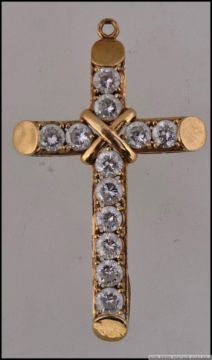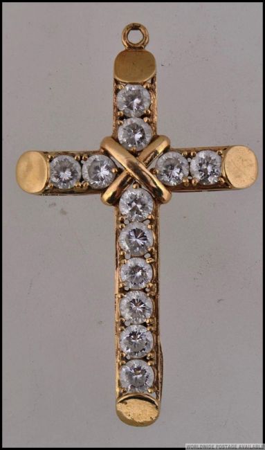 A tested 9ct gold crucifix pendant set with CZ. Measures 5cms. Weight 6g.