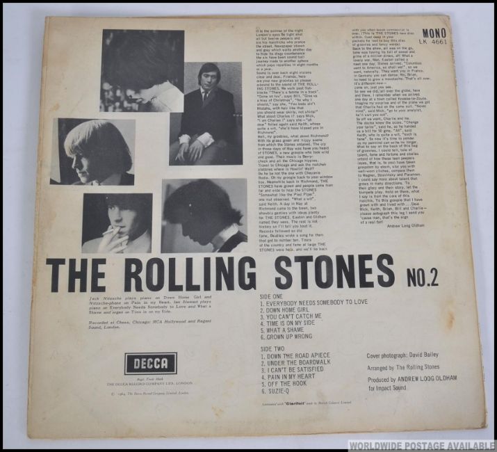 The Rolling Stones No 2 Censored paste over cover. Mono LK 4661 Released 1964 Etched / Stamped XARL - 6619 - 1A on side 1 Etched / Stamped XARL - 6620 - 1A on side 2. The vinyl has surface scratches to both sides but still plays well, the sleeve shows creases and the glue has come unstuck to the top.