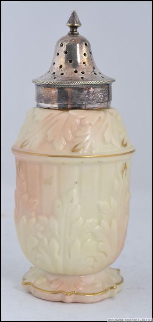 A Locke & Co Worcester sugar caster having a silver plated finial topped cover with circular pieced apertures and foliate moulded blush ivory body being cast in relief with acanthus leaves. The base with black mark to base. Measures 15cms high. Condition Good, no visible damage.
