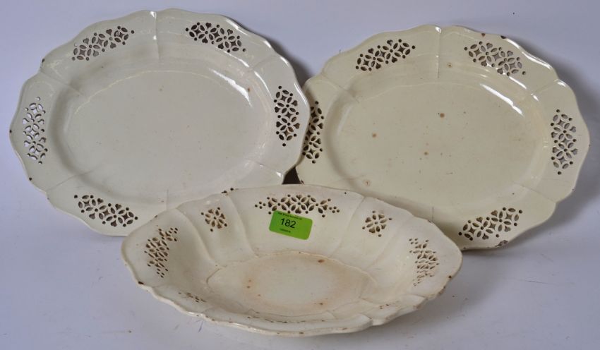 A pair of 18th century Leeds / Staffordshire Creamware Drainer Dishes -plates believed late 18th century of fluted oval form having foliate and geometric pierced panels to the borders together with a dish with similar pierced designs.