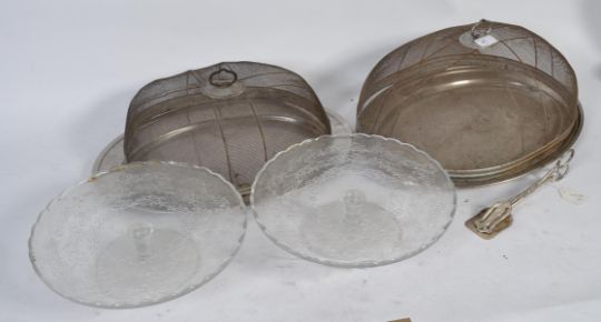 Two Wirex meat / cake cloches with sliver plate trays along with a pair of well decorated glass cake stands