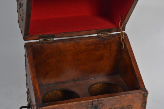 A Georgian style leather campaign tantalus decanter case with stud decoration and depicting soldiers to front