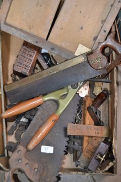 A good collection of vintage tools to include saws , chisels , rules etc.