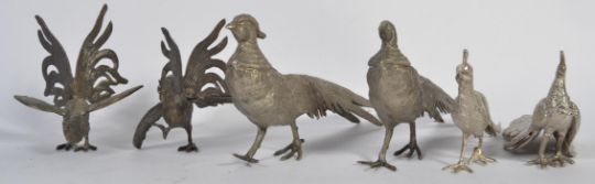 A pair of white metal fighting cocks along with a white metal peacock and pheasants.