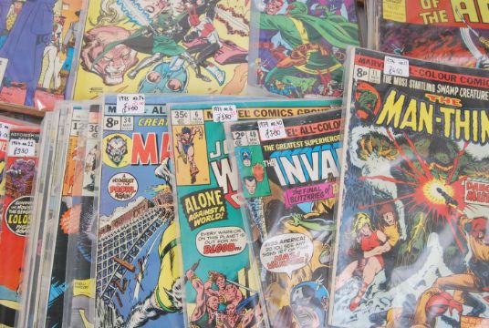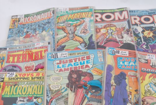 COMIC BOOKS; A fantastic collection of vintage (mostly 1970's & 1980's) Marvel & DC comic books. Most in plastic covers, some bagged into runs or sets. Titles to include; Man Thing, Invaders, War Lord, Kull, Human Fly, Claw, Machine Man, It!, Spider-Woman, Micronauts, Justice League, The Flash, ROM, Planet Of The Apes etc Approx 80 in total.