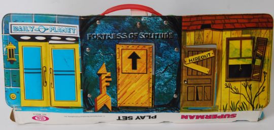 SUPERMAN: A fantastic vintage Ideal made Superman Playset. Made of vinyl, the playset neatly folds flat. Playset can be folded out in a variety of ways to reveal different scenes from Superman. Comes with a good quantity of original cardboard figures and some bases.