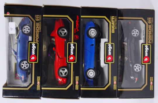 BURAGO: A collection of 4x 1:18 scale boxed diecast model Burago cars. Dodge Viper, 2x Porsche 911's, and 2x Bugatti. Each within original box.