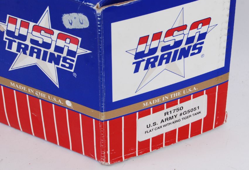 G SCALE: An original G Scale ' USA Trains ' R1750 ' US Army Flat Car With Tiger Tank ' railway trainset wagon. Within the original box, with instructions. Appears little used.