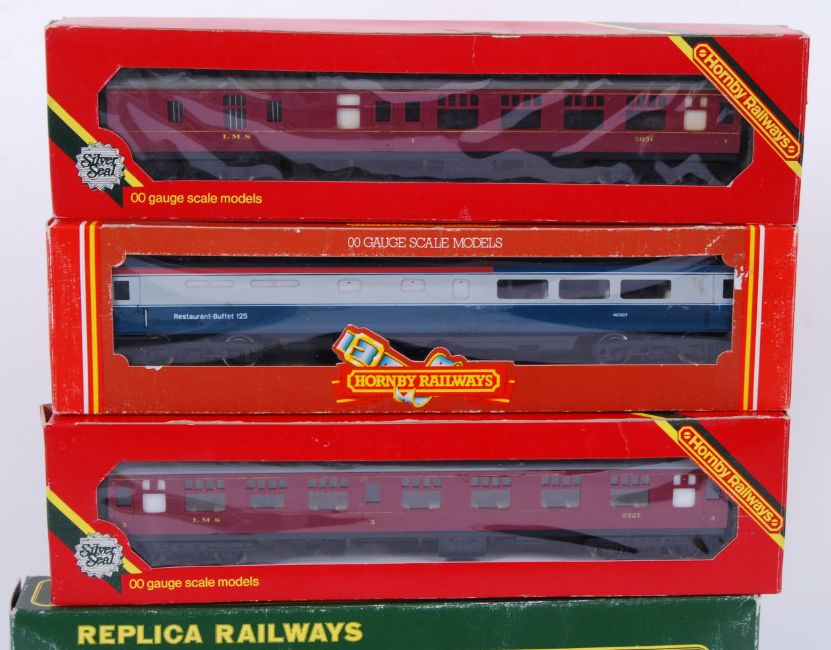 00 GAUGE: A collection of 5x boxed 00 gauge railway trainset carriages to include Hornby R936, R427 and R395, the other two being ' Replica Railways ' 12202 and 12222. All with original boxes.