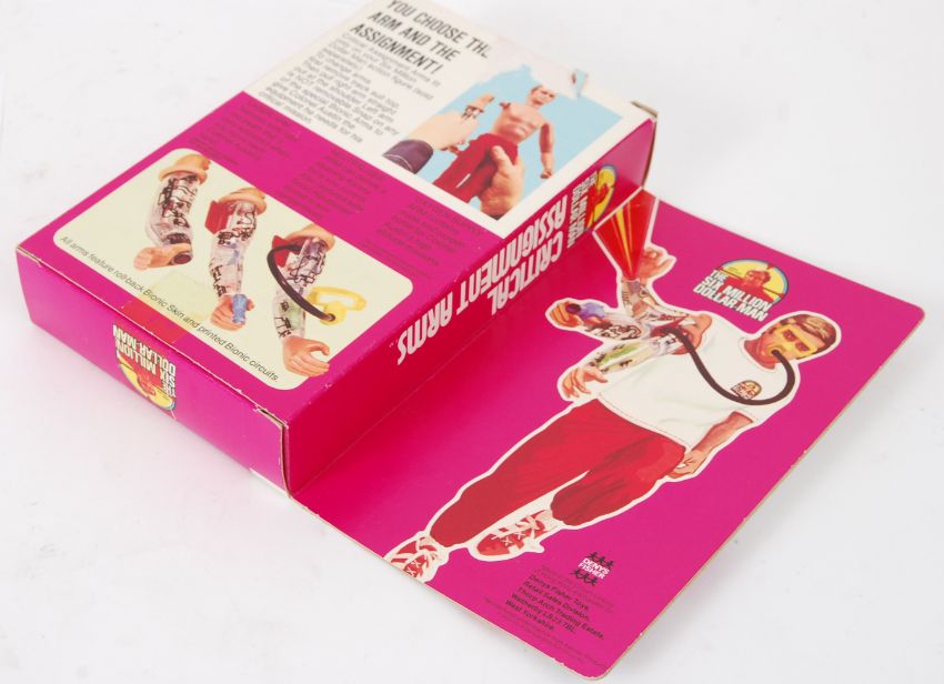 SIX MILLION DOLLAR MAN: An original retro vintage Denys Fisher Six Million Dollar Man ' Critical Assignment Arms ' action figure accessory set. Within the original box. Box very good, the flap remaining unfolded. Plastic window is missing / damaged. Otherwise good.