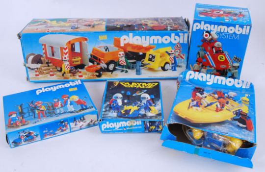 PLAYMOBIL; A great collection of 5x vintage 1980's West Germany made Playmobil sets, each within their original boxes. Sets include; 3561 Wintersport, Playmo Space, 3474 Construction Series, 3479 Fishing Boat, and 3538 Raceboat.NOTE: From a private collection of vintage West Germany made Playmobil (all from the 1980's). All sets are generally believed to be complete, although we have not checked any ourselves so please satisfy yourselves prior to bidding. Some sets are mint and unused, others have the contents carefully bagged inside the boxes. Boxes are generally very good to mint condition and a few that are poor. Please view images / ask for specific condition requests.