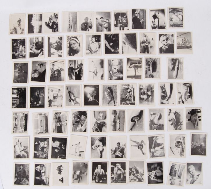 JAMES BOND BUBBLEGUM: A near complete set of vintage Somportex Ltd ' James Bond 007 ' Thunderball ' ' bubblegum collecting cards. Numbers 1-72. Missing just 3x cards - 16, 19 and 25, otherwise complete. With a small quantity of duplicates / spares. All featuring views from Thunderball, with information to reverse.
