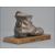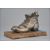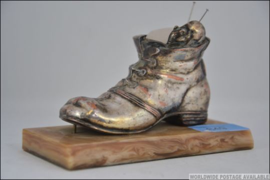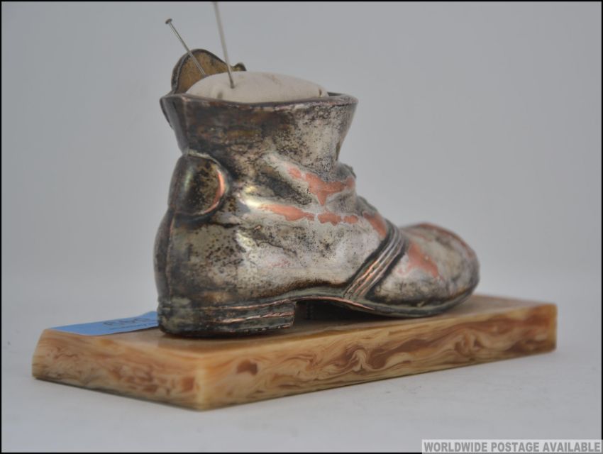 A silver plated pin cushion in the form of a boot with a mouse on the edge being raised on a caramel marbled base. measures 14cm wide