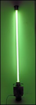 A large Industrial explosion proof floor standing - wall fit fluorescent green tube strip light. The large glass cylinder shade housing red tube light having a stunning large polished aluminium box mounted base. Originally from the British cellophane factory being rewired with red tube light added. Measures(cm) Height 189.