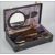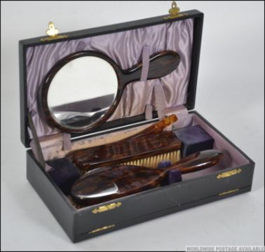 A vintage cased vanity set, appearing to be complete (but unchecked), with faux tortoiseshell decorated mirror, brushes etc.
