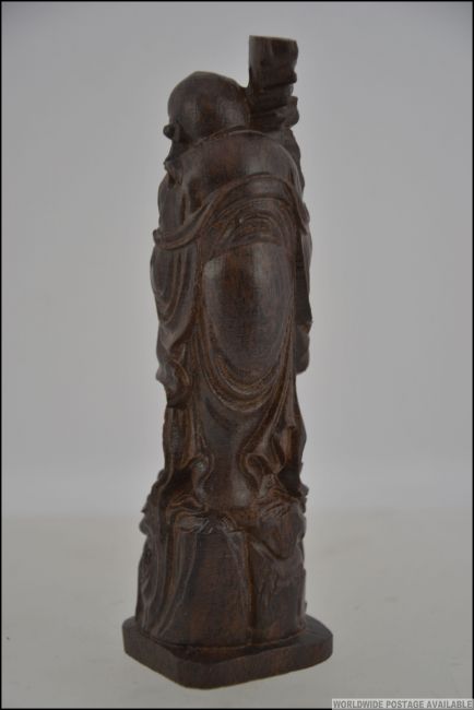 A rare agar wood carved oriental figure of an Elder, carrying a peach. Measures: 15cms long.