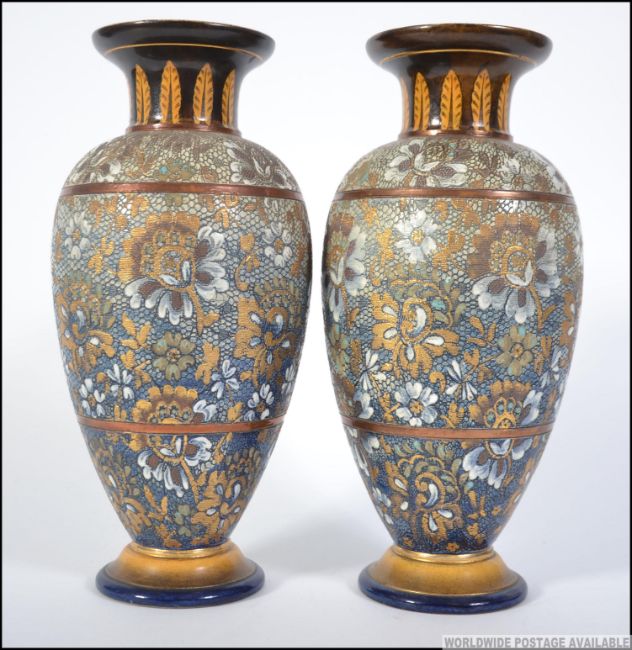 A Pair of Doulton Lambeth Art Nouveau stoneware glazes bases with trumpet flared tops with wheatsheaf design over bulbous bodies of foliate gilded form being impressed stamps to the base. Measures: 32cm high.
