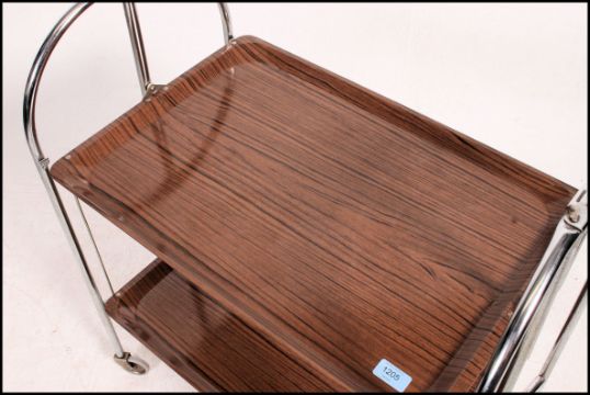 A 1970's retro chrome and faux bakelite folding drinks / hostess trolley with chrome frame, folding trays, all on castors to base